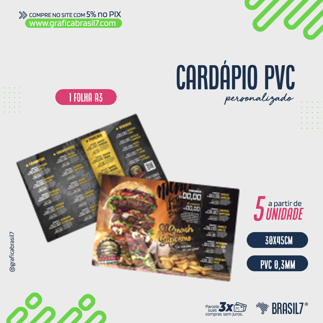 CARDÁPIO 1 FOLHA A3 em PVC 0,3mm 45x30cm